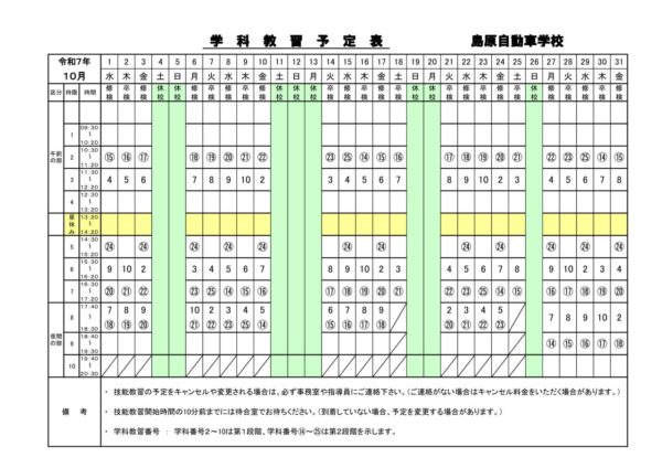 普通車予定表(R7年10月中)